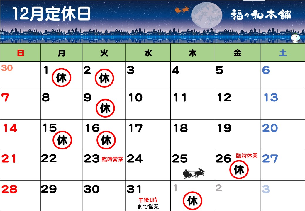 12月定休日のお知らせ